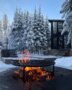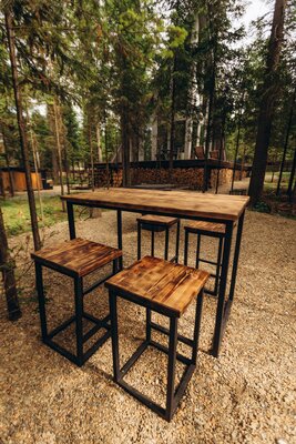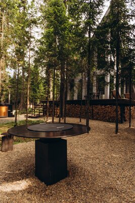 Гриль-очаг позволяет готовить одновременно несколько блюд на дровах и угле, вокруг гриля расположен стол, на который можно поставить посуду, и здесь же у костра можно жарить мясо, рыбу и овощи за душевными разговорами.