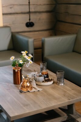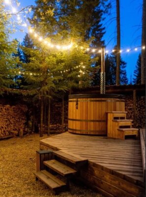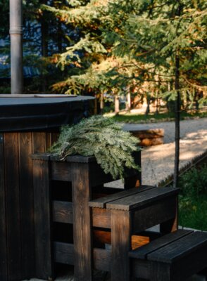 У каждого дома установлена купель Фурако. Наполнена горячей водой, в которой можно не только очищать тело, но и отдыхать душой. Оптимальная температура — 40-50 градусов. Сотрудники подготовят купель и передадут ее гостям в разогретом виде. Время остывания воды зимой 2-3 часа, летом — 4-5 часов. Стандартное время готовности — 19:00. Запрещается самостоятельно топить Фурако.