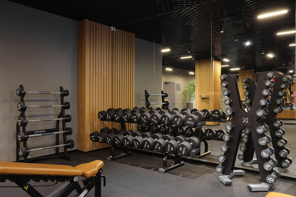 - зона свободных весов — гантельный ряд, скамьи для жима и многофункциональные кроссоверы;