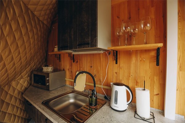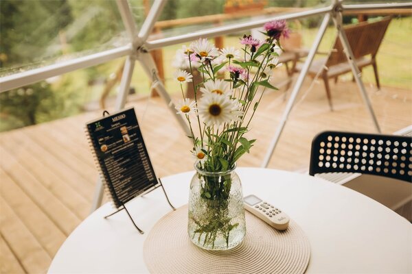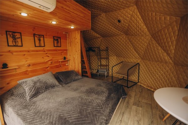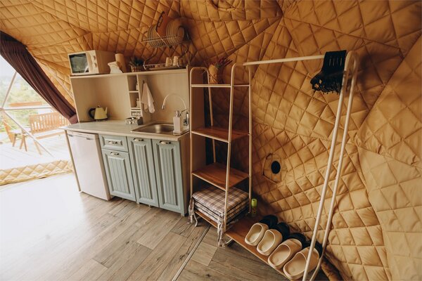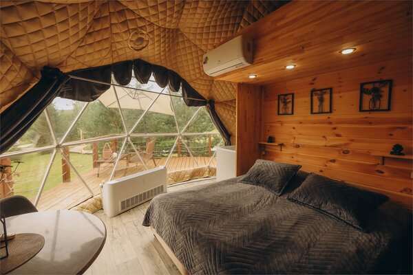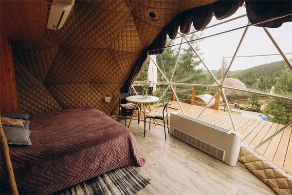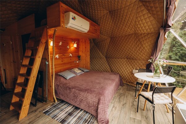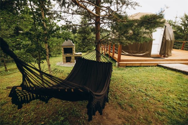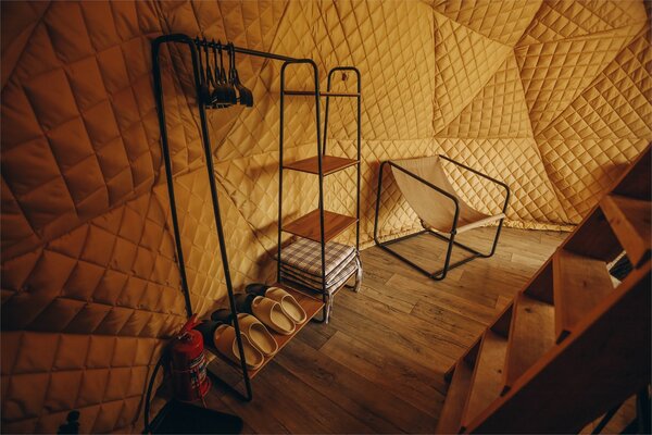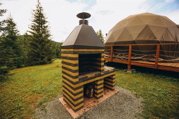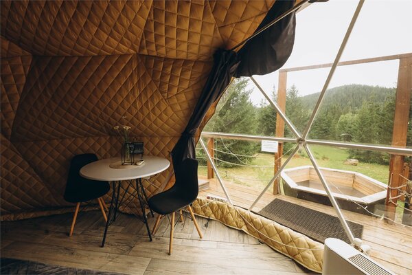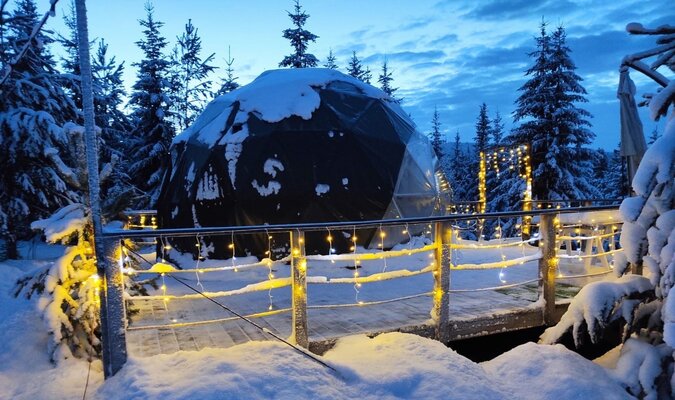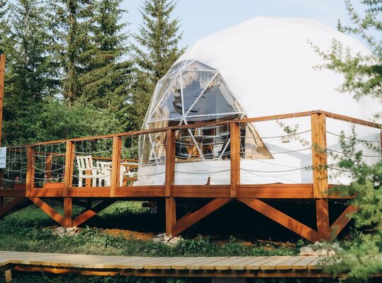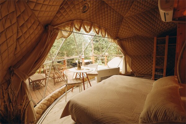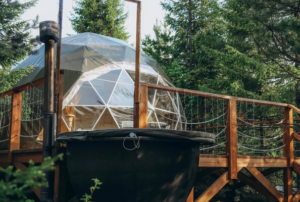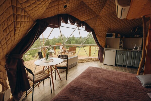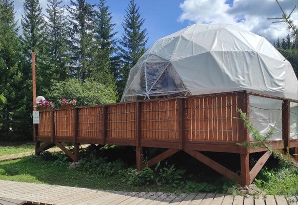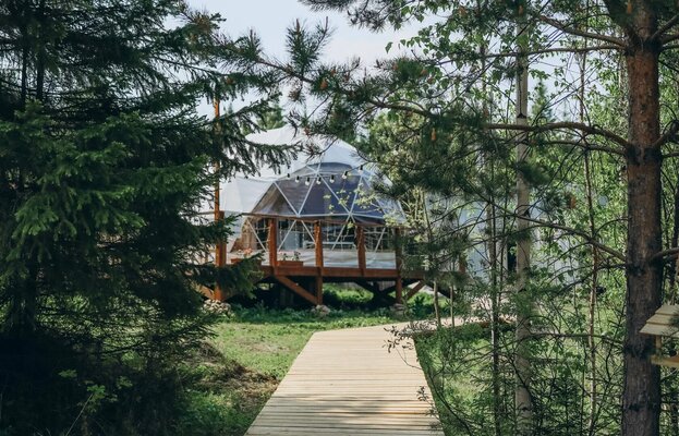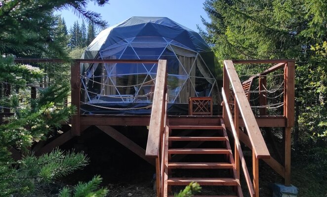 Большой купольный шатер (до 30 гостей) расположен в живописной локации с видом на лес.