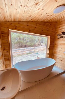 Скоро в глэмпинге откроется для бронирования уютная баня на дровах — прекрасное место для встречи с друзьями после активного и насыщенного дня. Внутри парная, вмещающая до шести человек, а также березовые веники и комфортная зона отдыха, где можно расслабиться и поделиться впечатлениями.