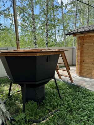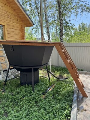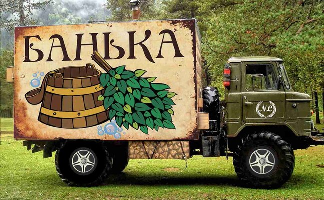 На живописном берегу по согласованию, не менее чем на сутки, можно установить баню на колесах (передвижную).