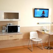 На территории к Вашим услугам зоны отдыха, детская и спортивная площадка. Внутри главного здания располагается кафе. Апартаменты располагаются на охраняемой территории Центра. Проживающим в пансионате предоставляется бесплатная автостоянка. В непосредственной близости находятся торговые, фитнес- и развлекательные центры.