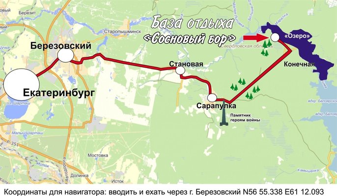 Движение от Екатеринбурга через г. Березовский. двигаться всё по главной дороге до S- образного перекрестка где указатель на «Сарапулку», свернуть налево и выехать за границу города. Далее двигаться по схеме через поселки Становая, Шиловка. В Сарапулке, доехав до маленькой площади со стелой в центре, повернуть налево перед магазином «Флагман». Далее следовать прямо по дороге до озера, свернуть на грунтовую дорогу. Двигаться по указателям на базу отдыха «Теремки».