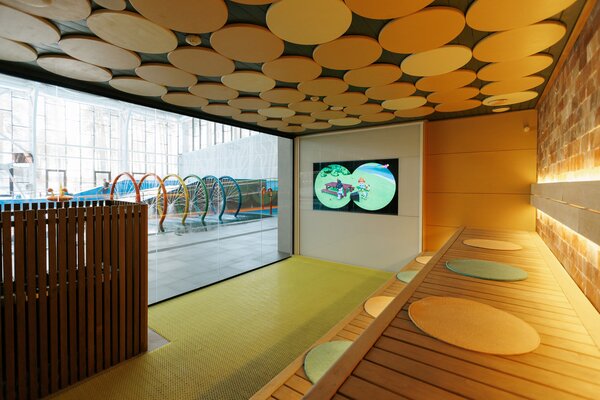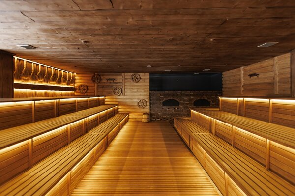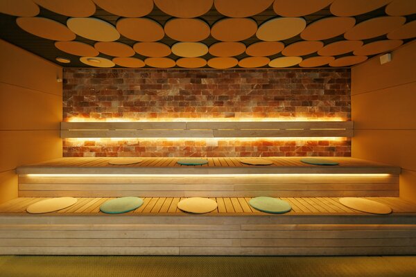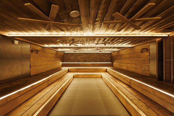 Дети хотят пробовать все, что делают взрослые. Поэтому для них предусмотрена детская баня–санариум. Это сертифицированное безопасное помещение с комфортной температурой, стеной из соляных кирпичей и большим телевизором только с добрыми мультфильмами для детей и их родителей. На полках предусмотрены сиденья и нескользящее покрытие на полу.