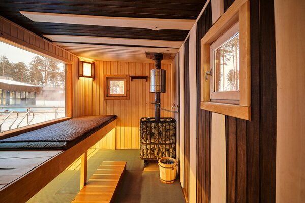 - русская баня расположена здесь же. Из нее после парений можно попасть прямо в купель и охладиться;