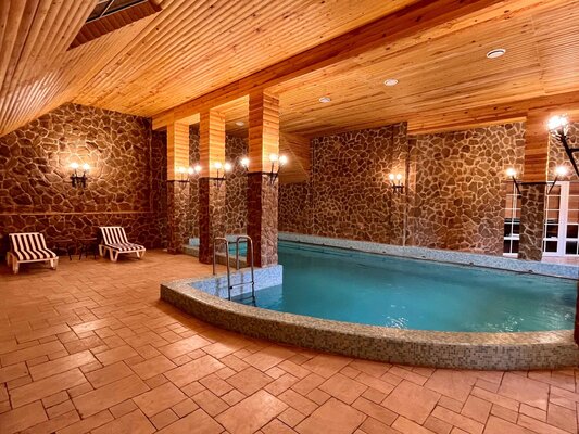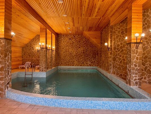 Просторный бассейн расположен в доме с баней и доступен исключительно для тех, кто забронировал данный коттедж. Температура воды в бассейне поддерживается на идеальном уровне, а рядом с водной зоной обустроена уютная зона отдыха с шезлонгами, где можно расслабиться и насладиться безмятежностью загородной жизни.