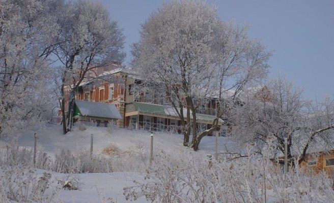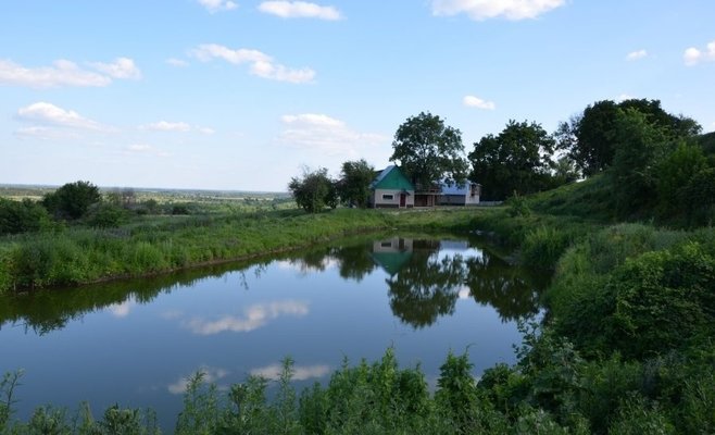 - Проезжаете через село Терновое (обратите внимание, с правой стороны в центре села – красивая деревянная церковь, выкрашенная голубой краской) и через 7 км Вы прибываете в туристический комплекс «Русская деревня».