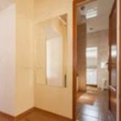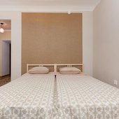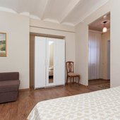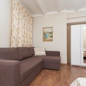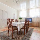 В гостиной установлен телевизор, обеденный стол и 1 двуспальная кровать.