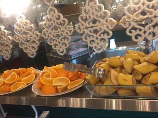 В меню широко представлены блюда татарской, русской и европейской кухонь, огромный выбор салатов и закусок, всевозможных десертов и коктейлей. Порадует также и великолепный выбор напитков и вин, который подобран к каждому имеющемуся в меню блюду.