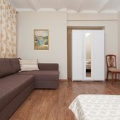 Приготовить или разогреть еду можно на собственной кухне, оснащенной всей необходимой бытовой техникой и посудой. Так же поесть можно отправиться в кафе неподалеку или купить продукты в магазине поблизости.