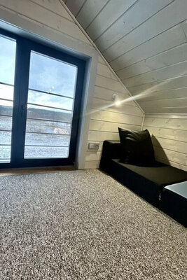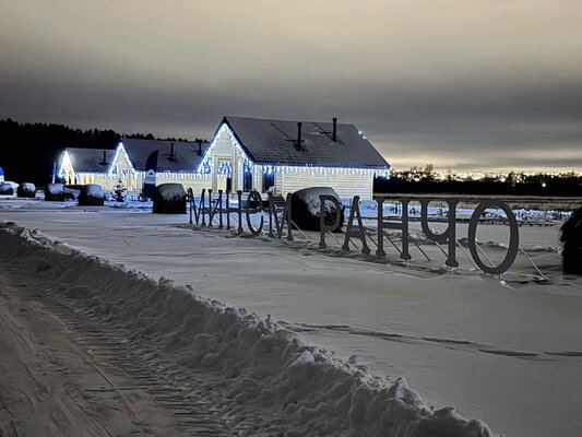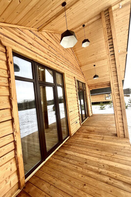 На террасе банного комплекса находится комфортный банный чан, предлагающий потрясающий вид на Сосновый Бор. Здесь гости могут погрузиться в горячую воду и насладиться атмосферой спокойствия и уюта.
