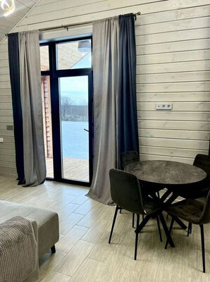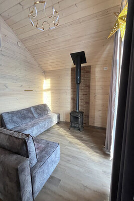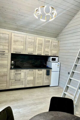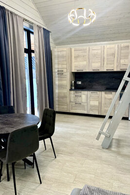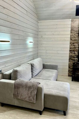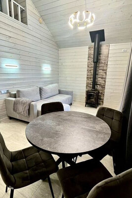 Зона отдыха включает комфортный диван, обеденный стол и камин, который дарит тепло и уют, а панорамные окна открывают живописные виды на окружающий лес. Кухня оснащена всем необходимым: посудомоечной машиной, холодильником, чайником и кухонными принадлежностями, что делает посещение бани более удобным и приятным.