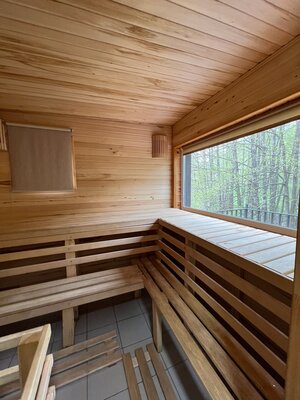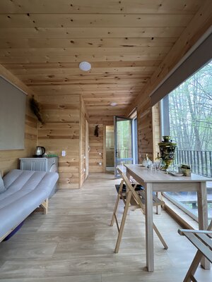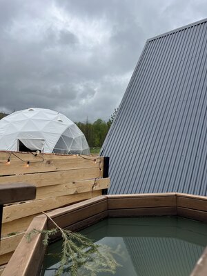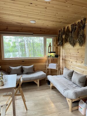 На территории глэмпинга есть баня, где вы сможете отдохнуть в специальной комнате и попариться с потрясающим видом на природу, так как у бани панорамное окно.