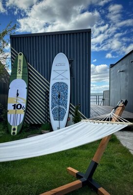 На территории глэмпинга есть комфортный спуск в воду для катания на сап-бордах.