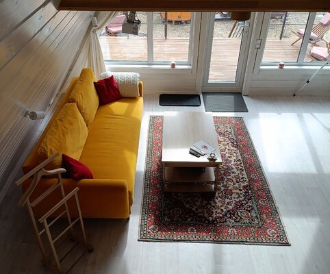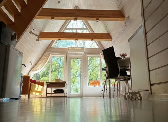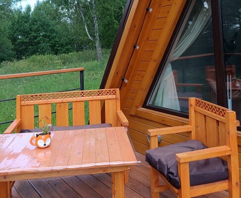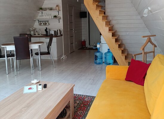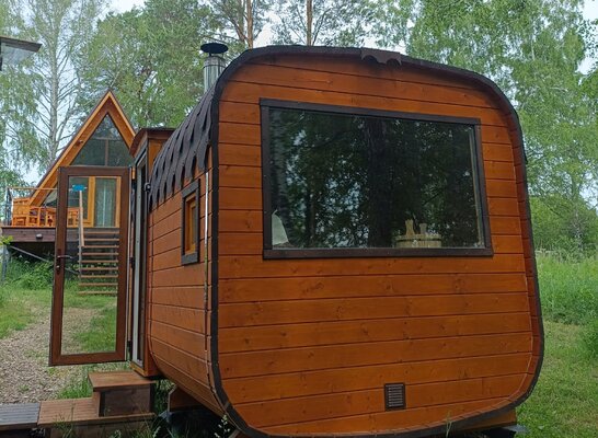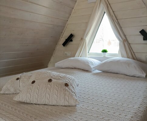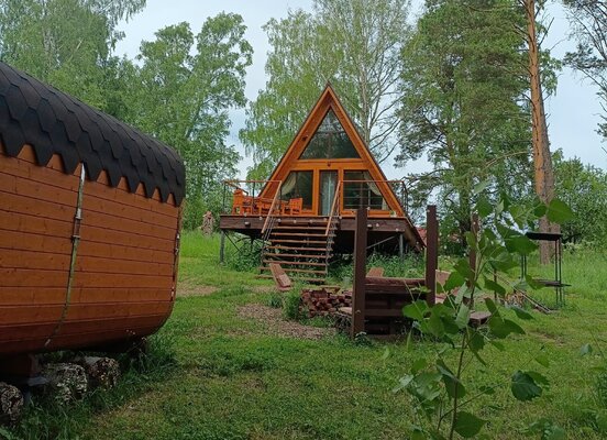На тщательно благоустроенной, закрытой территории вас ждет стильный треугольный домик A-frame с просторной террасой, а также банный комплекс, включающий баню-бочку и банный чан. Внутри домика продумано всё для комфортного автономного проживания: полностью оборудованная кухня со всей необходимой посудой и бытовой техникой, уютные спальные места (кровать на втором ярусе и раскладной диван внизу), а также персональный санузел с душем и гигиеническими принадлежностями. Для вашего максимального удобства предусмотрены теплые полы, кондиционер, Bluetooth-колонка и доступ к Wi-Fi.