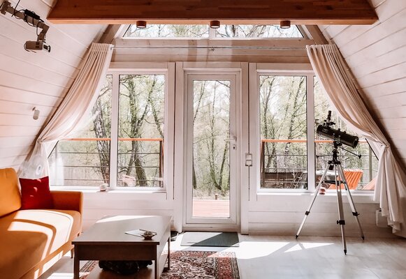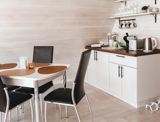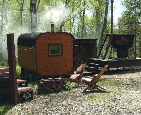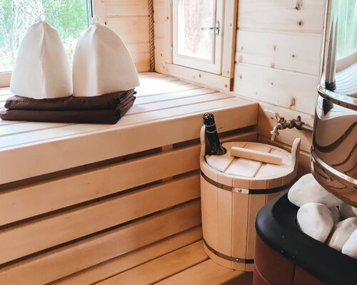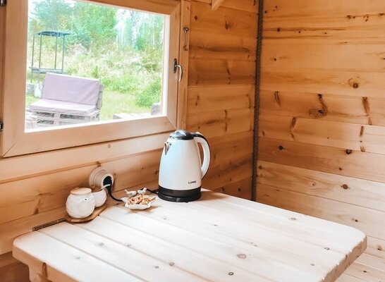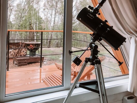Буквально в нескольких шагах от домика расположены баня и банный чан, где можно полностью расслабиться. Рядом оборудованы зоны для мангала и костра – идеальные места для пикника, приготовления шашлыка или просто посиделок под звездным небом, наслаждаясь тишиной и живым огнем. Для досуга гостей есть настольные игры, проектор для кинопросмотров и даже телескоп. В зимнее время территория превращается в сказочный уголок с залитой горкой, санками и плюшками.