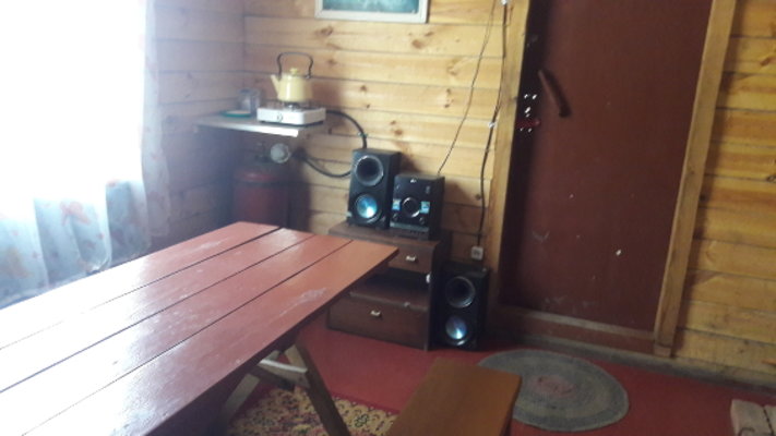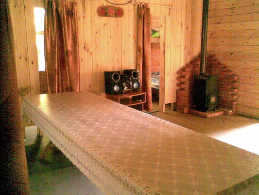 В навесе: Столы, лавочки, кухонный уголок, музыкальный центр, холодильник.