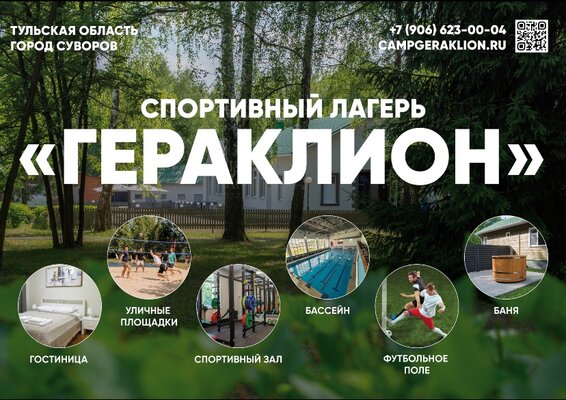 В живописном уголке Тульской области расположен спортивно-оздоровительный комплекс «Гераклион», идеально подходящий для спортивных сборов, семейного отдыха и активного времяпрепровождения. Комплекс предлагает комфортабельное проживание в уютных номерах с удобствами (в некоторых категориях — общими, расположенными на этаже), Wi-Fi, удобными кроватями и вместительными шкафами.