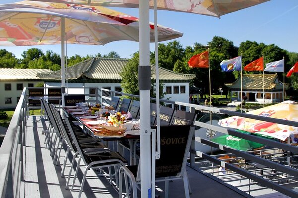 К залу примыкает обширная открытая терраса с видом на реку Шат. На террасе в хорошую погоду можно организовывать кофейные перерывы и фуршеты. Кофейные перерывы также можно организовывать в ресторане, который расположен в непосредственной близости от корпуса Ушу.