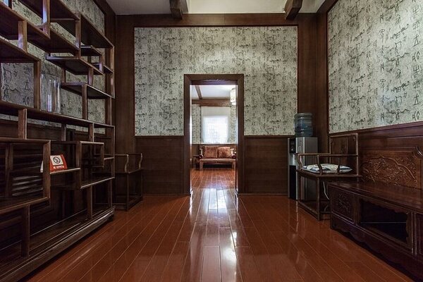 Чайный дом имеет три яруса. Удобно на втором делать деловое мероприятие, а на первом кофейный перерыв или фуршет. Ярусы соединены винтовыми лестницами. Зал декорирован деревянными резными панелями в традиционном китайском стиле.