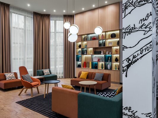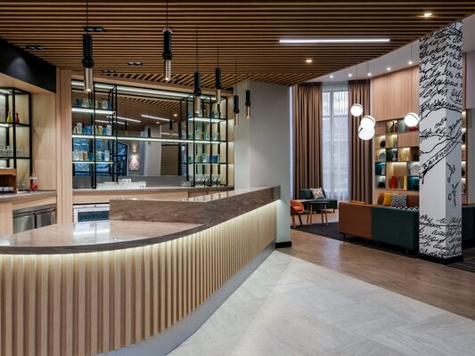 Оборудованный столиками, комфортабельными диванами и креслами, лобби станет отличным местом для работы в лёгкой непринуждённой обстановке. Оборудованный бар позволит насладиться отдыхом и панорамными видами на центральную площадь Парк Отеля.