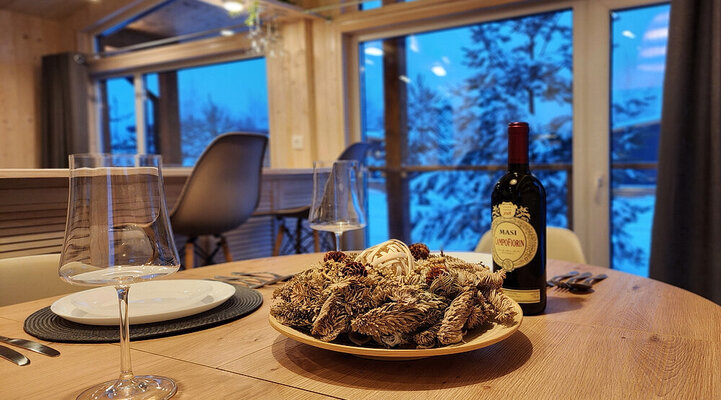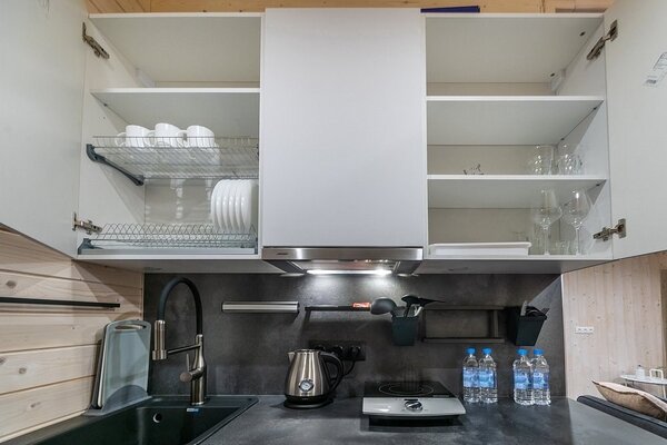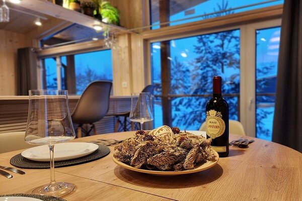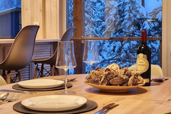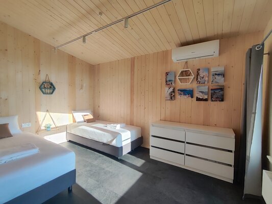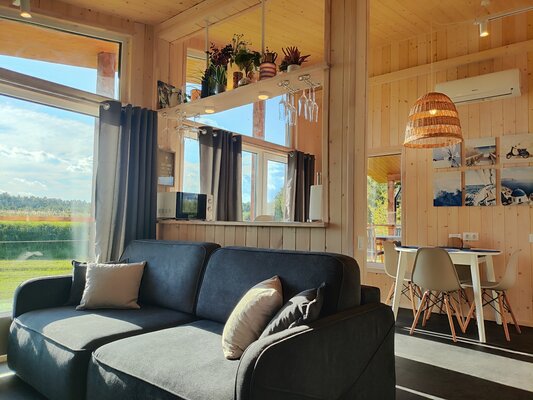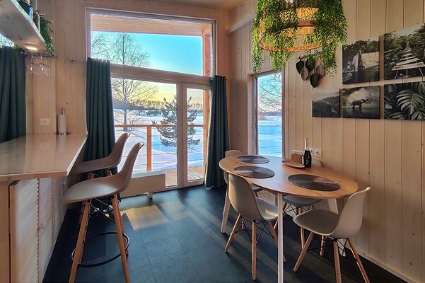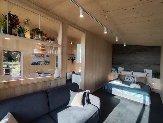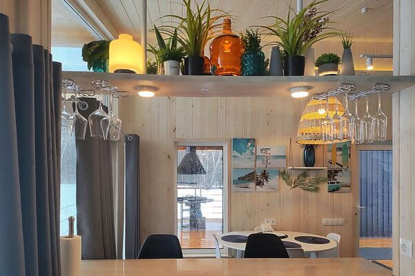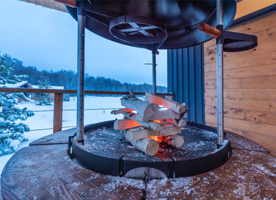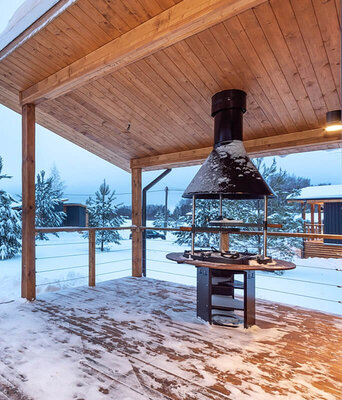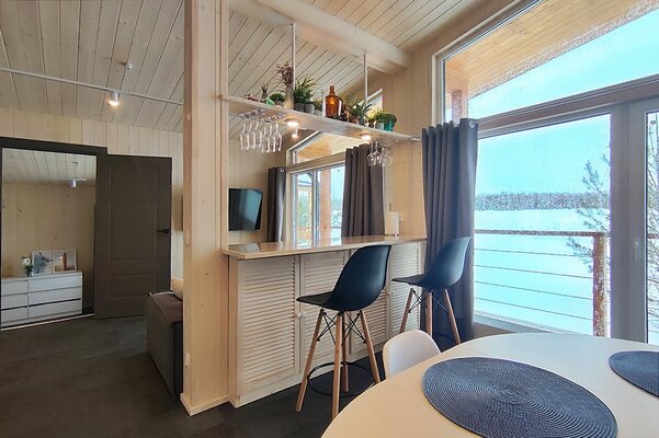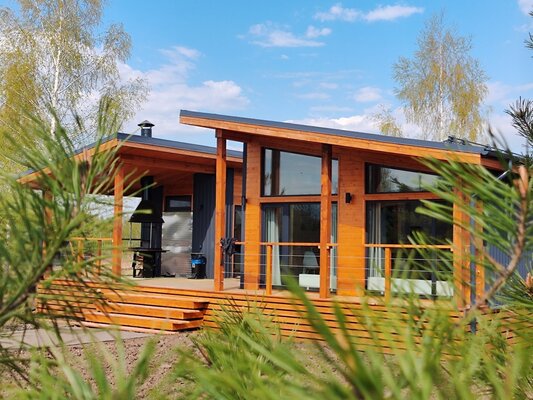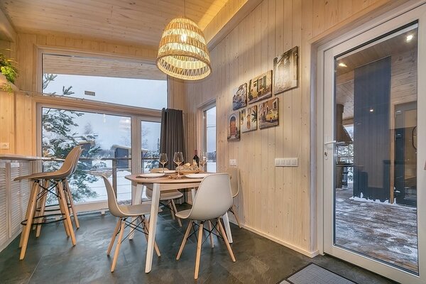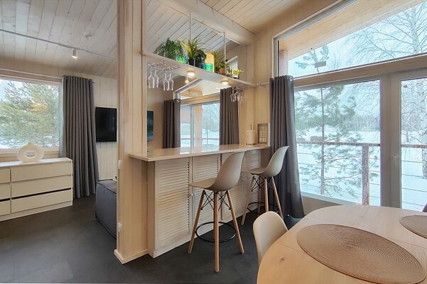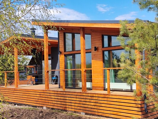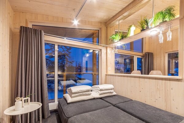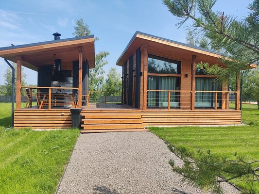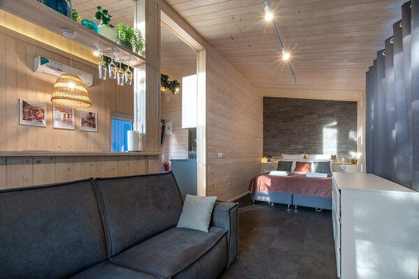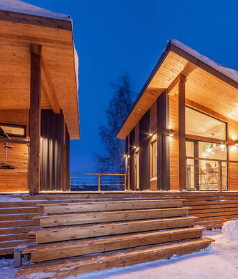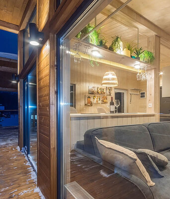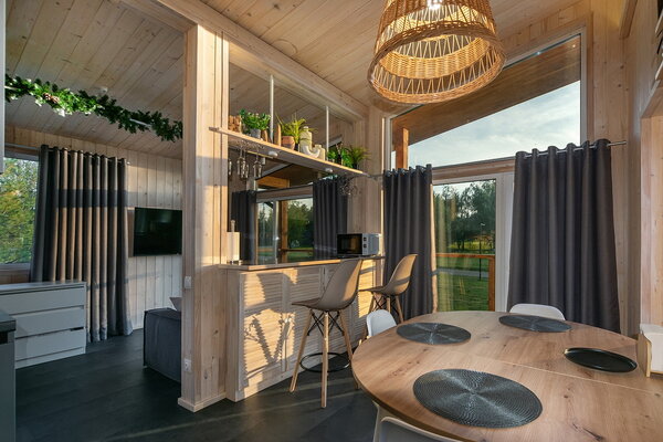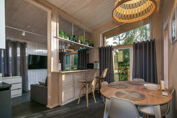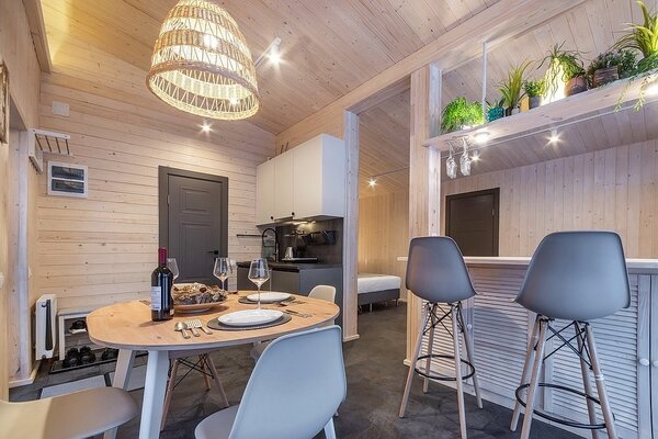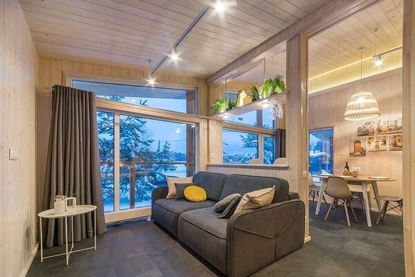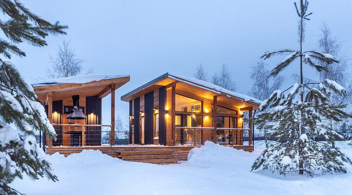 В вашем распоряжении комфортабельные коттеджи с панорамными окнами, рассчитанные на 4 или 6 человек.