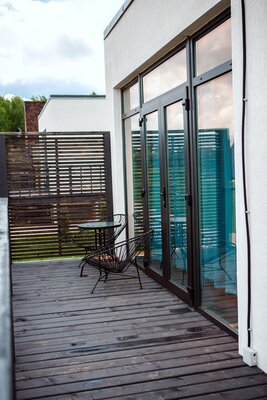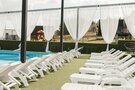 На территории банного комплекса «Жара» находится купель с холодной водой, рядом с которой расположены шезлонги и столик.