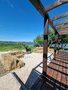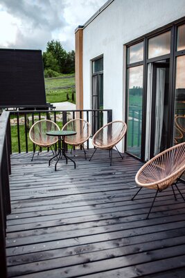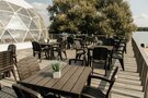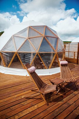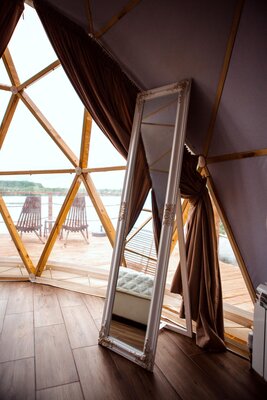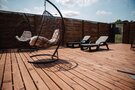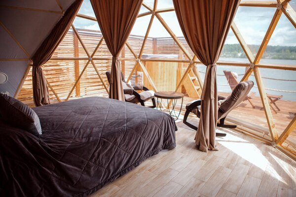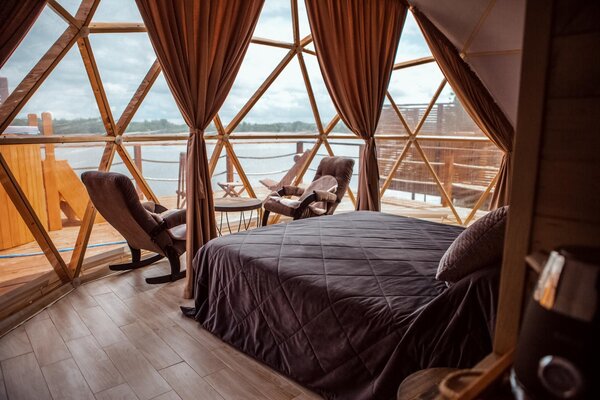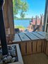 Территория окружена достаточно высоким ограждением, выполненным из натурального дерева, что создает ощущение уединения и спокойствия. Четвертая сторона, обращенная к воде, имеет сквозное ограждение, обеспечивая безопасность отдыха с детьми. Здесь также доступен горячий банный чан на дровах и удобная чайная зона под куполом со всей необходимой посудой, а также шезлонги и качели для отдыха на свежем воздухе.
