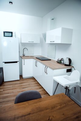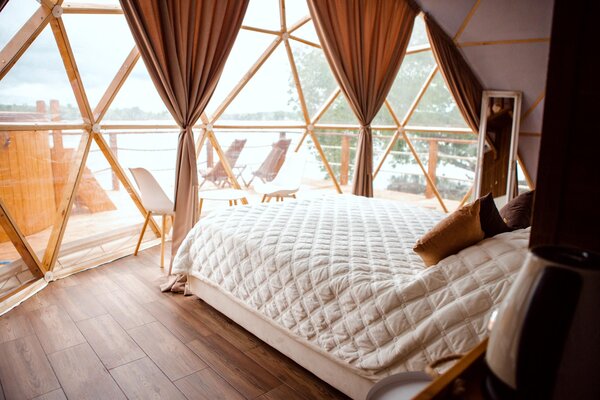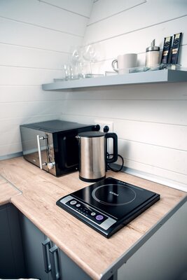 Вы можете не отказываться от Ваших привычек по части домашней еды и привезти все необходимые продукты с собой — в каждом домике есть мини-кухня. Это грамотно подобранный набор всего необходимого для приготовления пищи и сервировки блюд. В сферах мини-кухонь нет, но оборудованы чайные уголки, где предусмотрены чайник, микроволновая печь, холодильник.