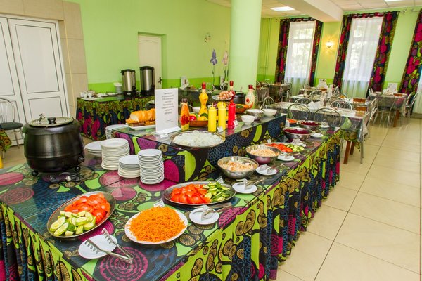 Обеденное меню непременно включает в себя 4-5 видов сезонных овощей, 3 вида первых блюд, одно из которых обязательно вегетарианское. Каждый день в меню блюда из курицы, рыбы, мяса или мясопродуктов. Не менее 3-х видов гарниров. Холодные напитки, также включены в стоимость, и подаются без дополнительной оплаты. Это может быть морс, компот или иной напиток. Соки и Минеральные воды вы можете преобрести за дополнительную плату в кафе санатория.