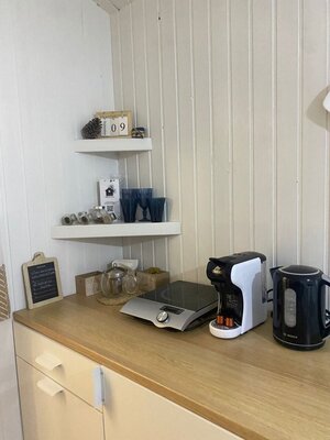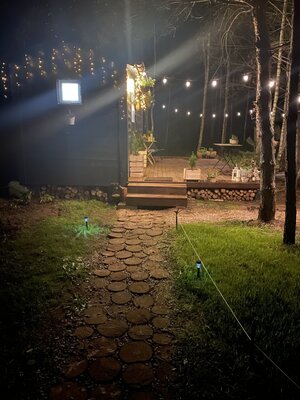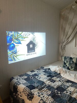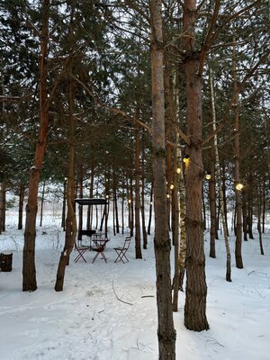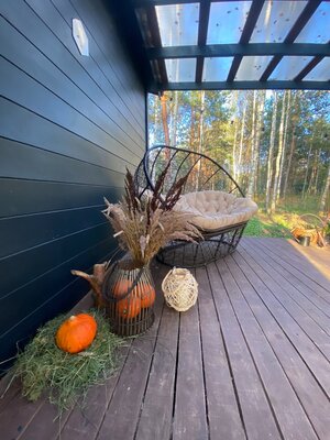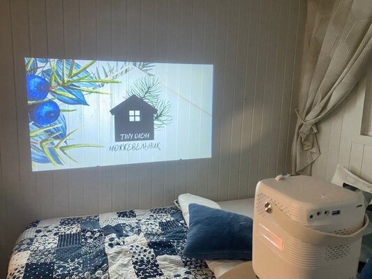 Костровая чаша пригодна для проведения приятных вечерних посиделок, где можно наслаждаться треском дров и запечь маршмеллоу. В «Можжевельнике» предусмотрены все удобства для комфортного пребывания на природе, включая кофемашину, проектор, мини-кухню, туалет и душ.