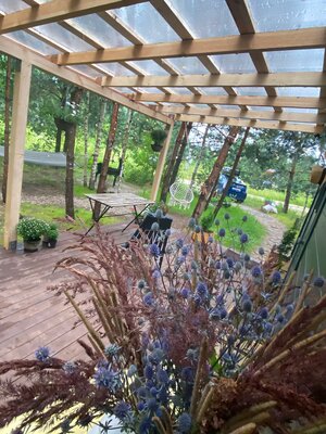 На территории есть уютная зона для отдыха на свежем воздухе. Гости могут расположиться на мягкой комфортной софе в уютном пледе и насладиться ароматным кофе или чаем, любуясь красивым пейзажем вокруг.
