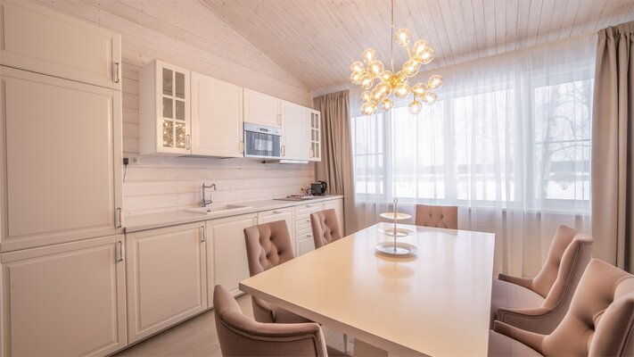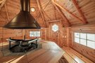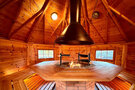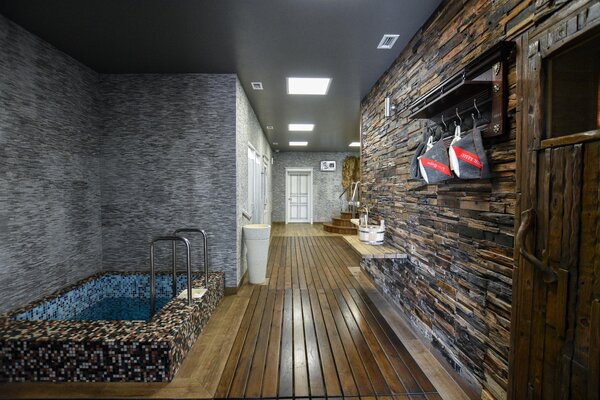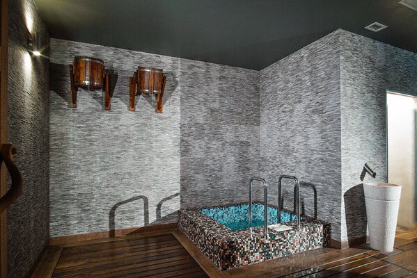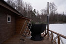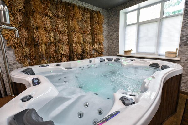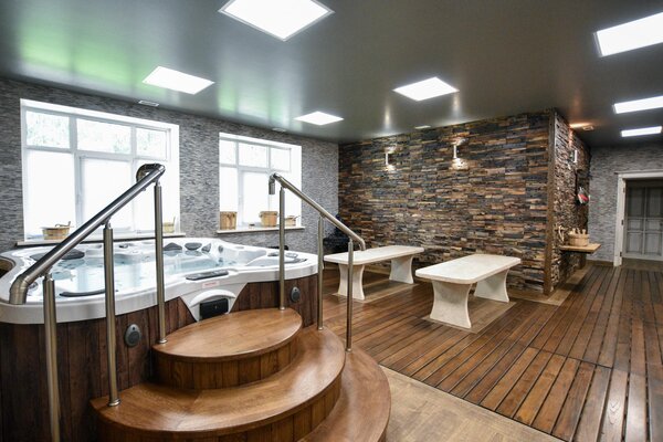 - две джакузи, одна из которых расположена внутри помещения, а вторая, подогреваемая, «быстрая река» на улице с видом на пруд и прорубь (в зимнее время);