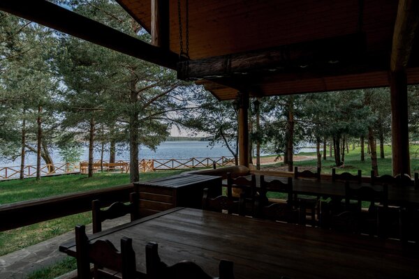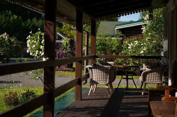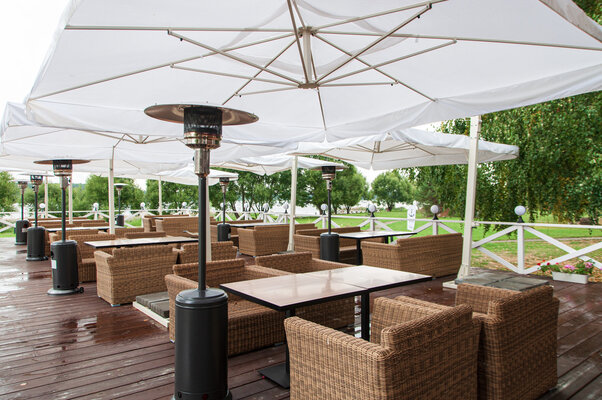 Открытая летняя площадка с камином для тех, кто хочет уединиться на террасе с великолепным видом на Волгу в окружении зелени и сосен.