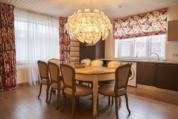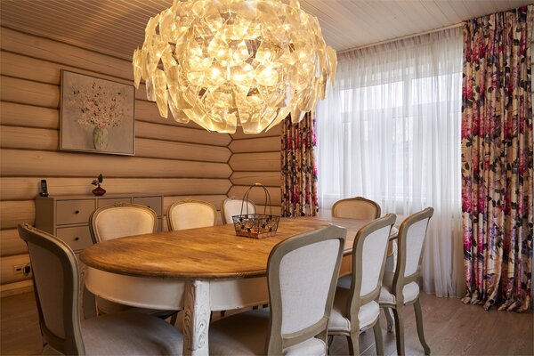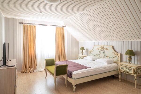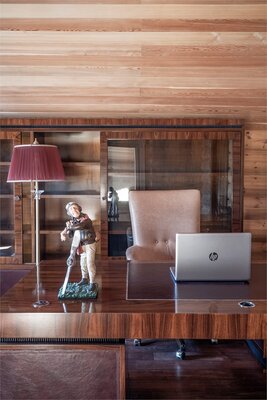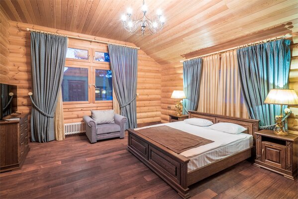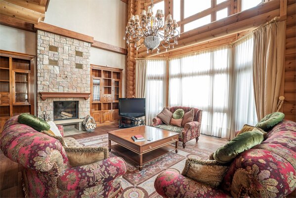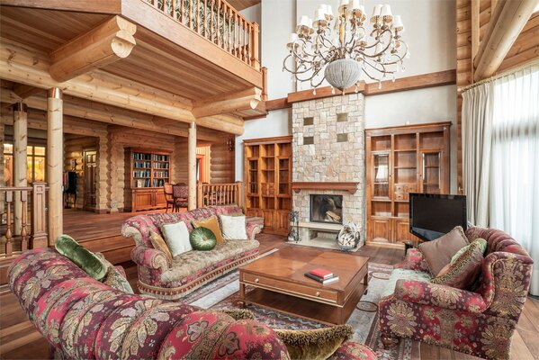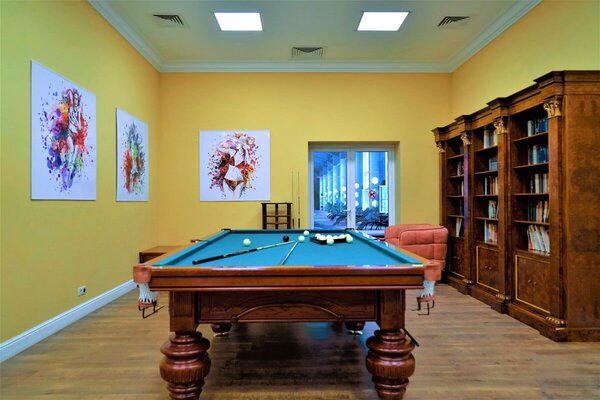 На втором этаже – пространство для отдыха настоящих джентльменов, кожаные кресла, атрибуты русской охоты, настоящий бильярд – два стола и выход на террасу с видом на Волгу.
