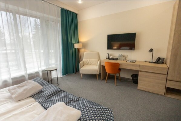 Уютный ресторанный зал «Трактир» вместимостью до 50 человек, из окон которого открывается прекрасный вид на березовую рощу. В Парк-Отеле «Басовское» гостям предлагается питание по системе полный пансион (завтрак+обед+ужин) в формате «шведский стол». Алкоголь не включен в стоимость.