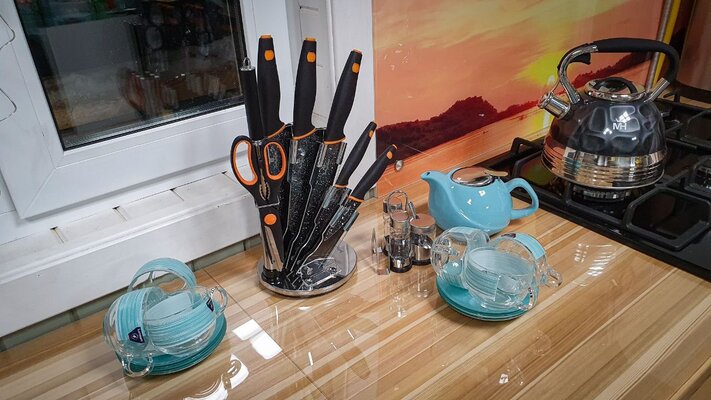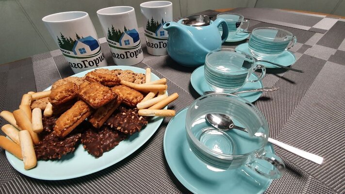 - Чай, кофе, сахар, лимон, корица, печеньки