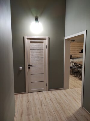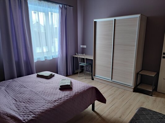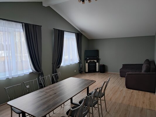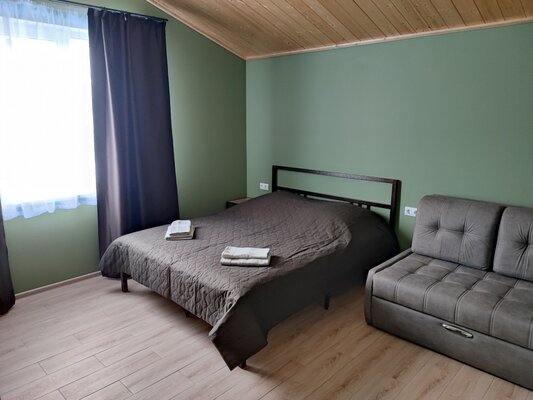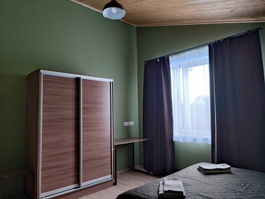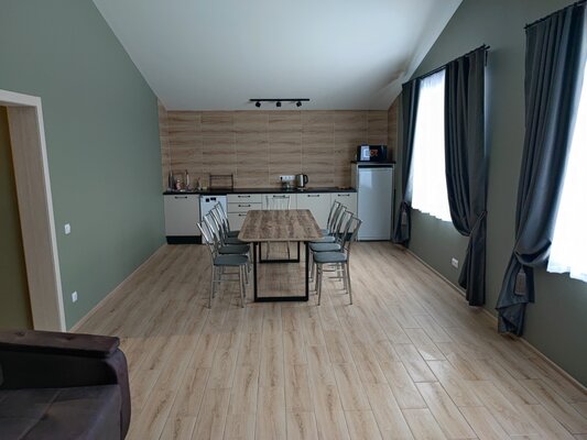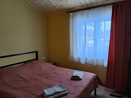 Внутри вас ждет просторная гостиная с современным телевизором и аудиосистемой, создающая уютную атмосферу благодаря камину. Кухня полностью оснащена всей необходимой бытовой техникой: холодильником, плитой, микроволновой печью, чайником, посудомоечной машиной и полным комплектом посуды. Система "теплый пол" и беспроводной интернет Wi-Fi обеспечат комфортное пребывание в любое время года. По желанию, можно расслабиться в сауне (за отдельную плату).