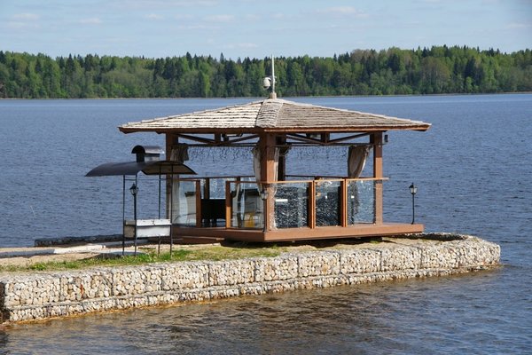 Открытая беседка на пристани — это возможность вдохнуть чистый воздух озера, полюбоваться красотой русской природы и провести время за столиками в дружной компании. Беседка рассчитана на 8 человек за столиками, 4 — за барной стойкой.