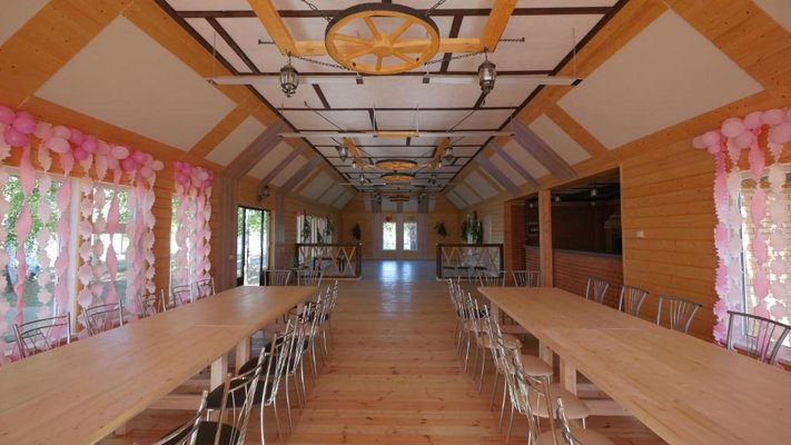 По запросу выдается посуда и сервируются столы за отдельную плату. Также здесь помогут с организацией питания и украшения зала.