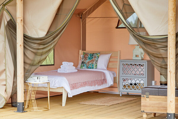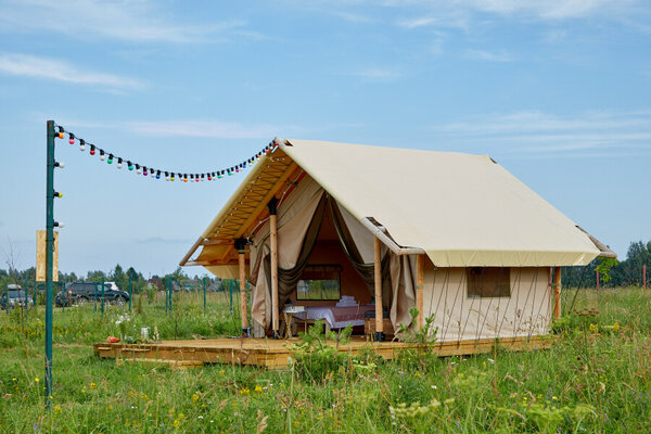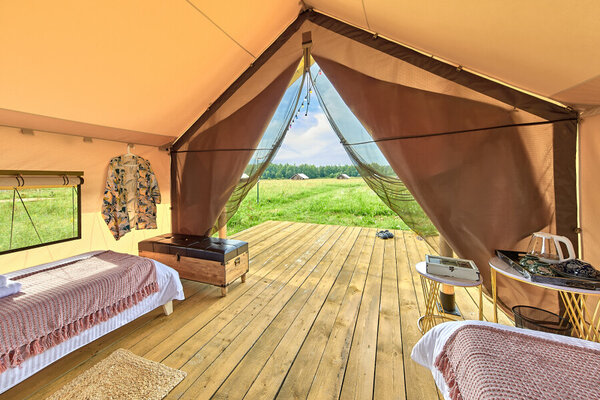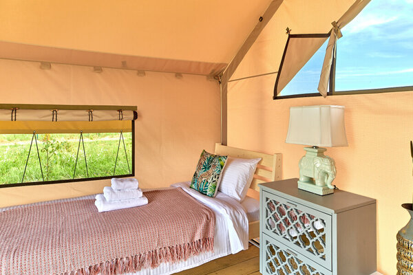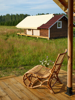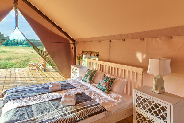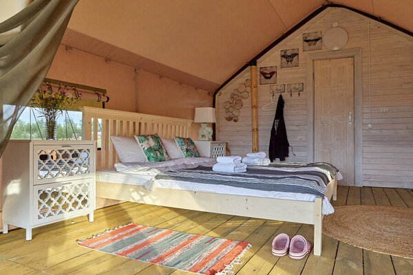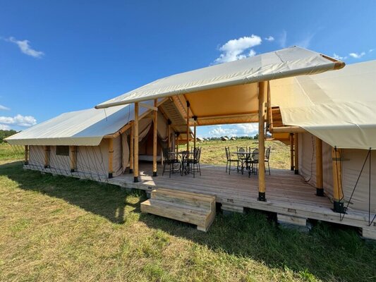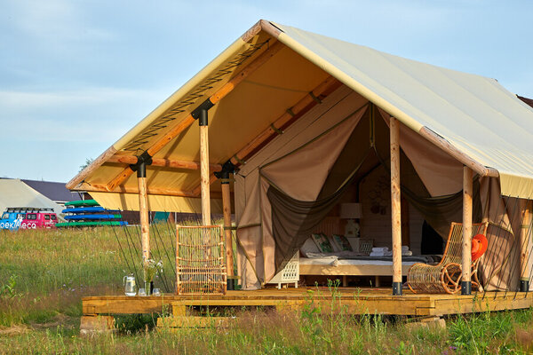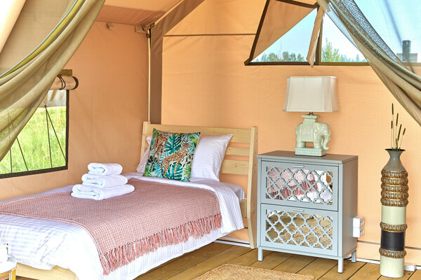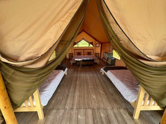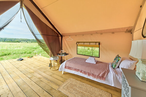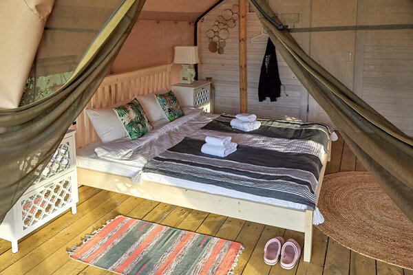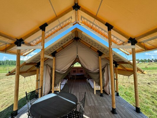 К вашим услугам — комфортабельные сафари-тенты, сочетающие близость к природе с необходимыми удобствами. Для максимального комфорта предусмотрены тенты с персональными ванными комнатами. Зимой можно выбрать уютные номера с кухней, душем и туалетом.