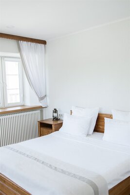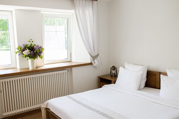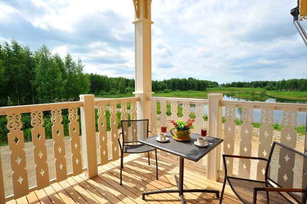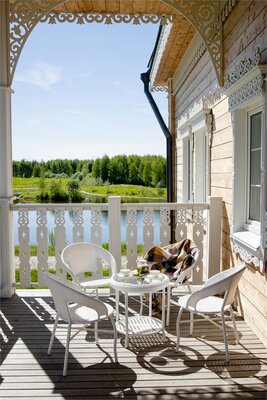 Здесь вы ощутите очарование русского стиля во всём: в белых кружевах резных окон, в дубовой мебели, в просторном светлом зале с видом на берёзовую рощу и, конечно же, в русской кухне.