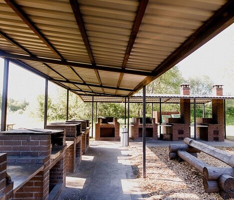 Стационарные и очень удобные мангалы, а также печи для казана расположены под навесами на берегу озера. Здесь есть всё для идеального барбекю: освещение, удобные столы, рядом расположена кухня, где удобно помыть овощи и фрукты, воспользоваться холодильниками, плитами или микроволновой печью. И даже если вы забыли что-то из посуды, это не омрачит ваш отдых. Всё от тарелок до ножей есть в оборудованной кухне. В таких условиях каждый почувствует себя шефом у мангала.
