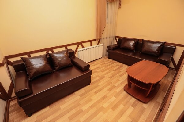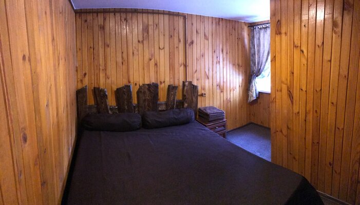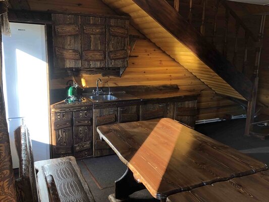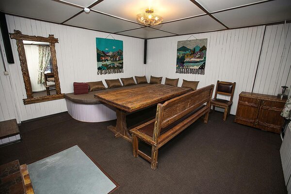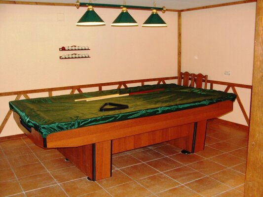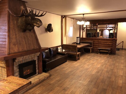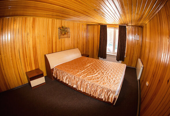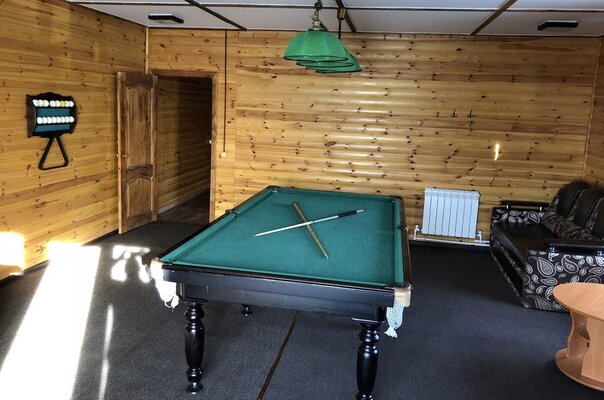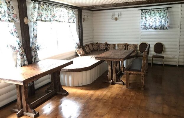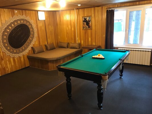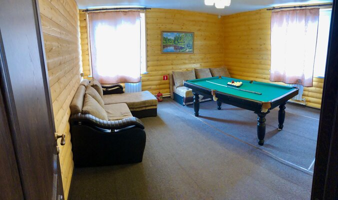 Для больших (до 50 человек) компаний имеется трехэтажный коттедж! Он располагает прекрасным банкетным залом с камином, также здесь есть большая Русская баня (топится сухими березовыми дровами!), бильярдная, спальные комнаты. Как удобно будет провести здесь к примеру свадьбу, особенно если к вам на праздник приехали гости из других городов. Подумайте: регистрация брака, банкет и первая брачная ночь – все в одном месте! И о размещении гостей беспокоиться не придется. Что касается банкета, это тоже не проблема. Желаете, чтобы повар и продукты были Ваши? Пожалуйста! Не хотите лишних хлопот? Переложите их на плечи персонала, для Вас организуют и роскошный стол, и великолепное обслуживание! Сопроводят Ваш банкет и музыкой, и танцами, и конкурсами! В доме есть все необходимое для полноценного отдыха на природе: на цокольном этаже оборудована кухня, бильярдная комната, баня, сан. узел, душ, на 2-м этаже банкетный зал, спальные комнаты (общее количество спальных мест в доме рассчитано на 26 человек), холодильник, микроволновая печь, чайник, плазменная панель, DVD-караоке аппаратура.
