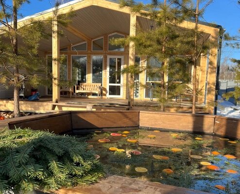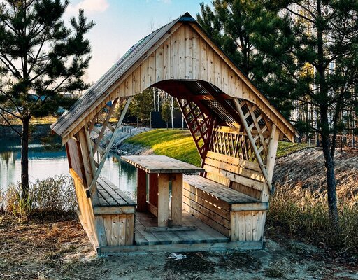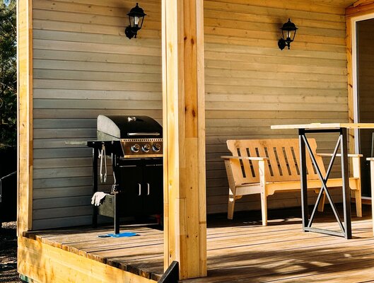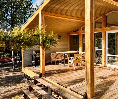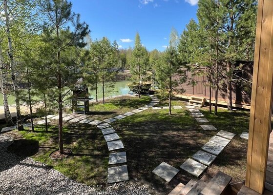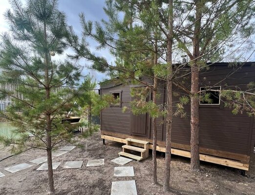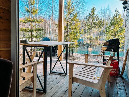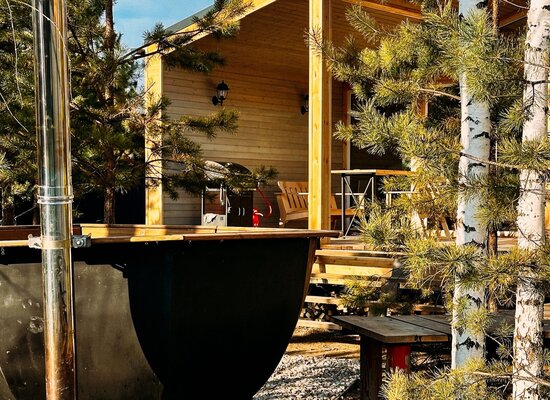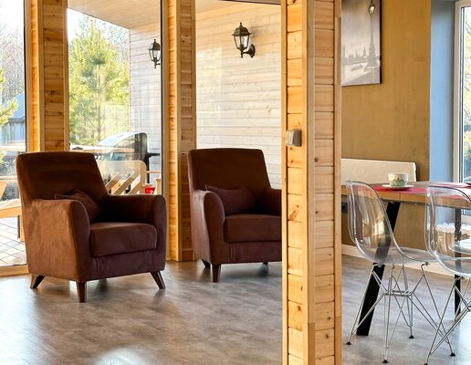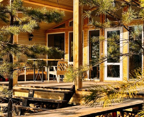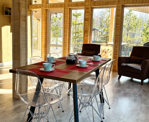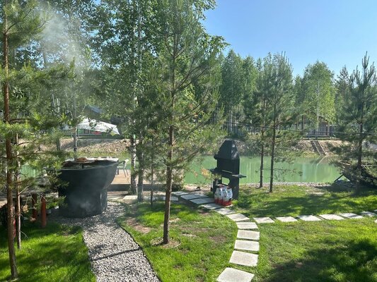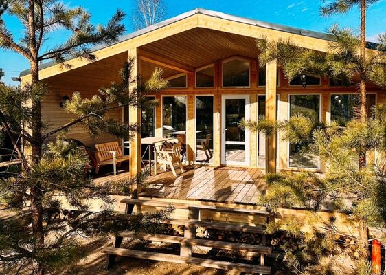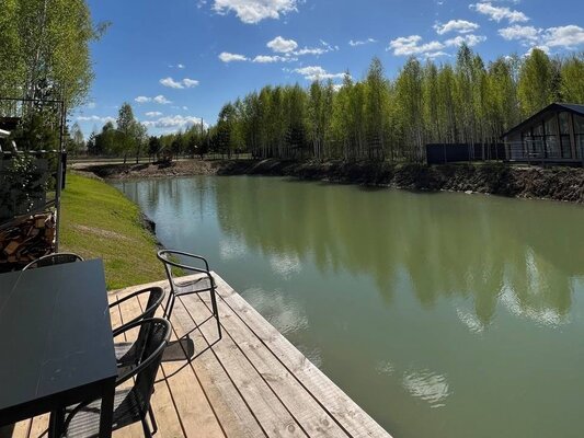 Сам комплекс раскинулся на закрытой территории у берега небольшого водоема. К вашим услугам — стильный одноэтажный 3-комнатный дом в современном стиле барнхаус, рассчитанный на комфортное размещение до 6 человек. Внутри дома: современный интерьер, панорамные окна, три спальни с двуспальными кроватями, полностью оборудованная кухня (с духовым шкафом, плитой, холодильником и всей необходимой посудой), персональный санузел, два ЖК-телевизора и Wi-Fi. Просторная обеденная зона и меблированная терраса с газовым грилем дополняют комфорт.