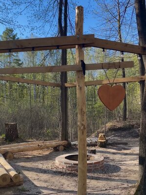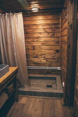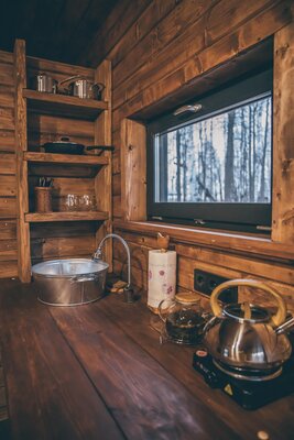 Уютная баня в лесу построена собственноручно и полностью из натурального дерева с уникальной чугунной печью, которая позволяет получать идеальный климат русской бани.