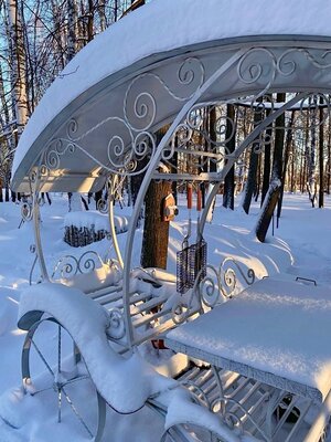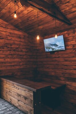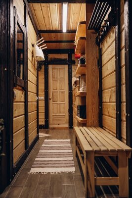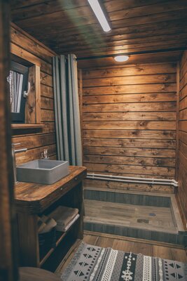 Домик-баня включает парную на дровах, комнату отдыха, санузел, душевую с ледяной «обливашкой», прихожую, открытую террасу с зоной отдыха и прохладную мини-купель.