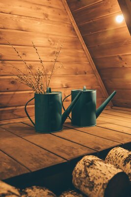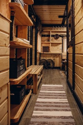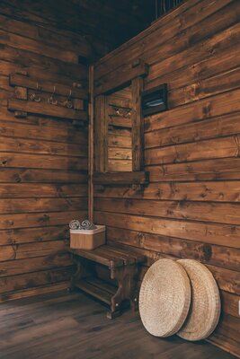 Баня оформлена в русских традициях с дровницей, антуражными шторами из мешковины, плетеными корзинками и бутылями, колесами прялок и ароматными травяными вениками, деревяными картинами и пузатым самоваром, и рассчитана на одновременное пребывание в ней 4-6 чел.