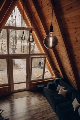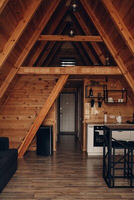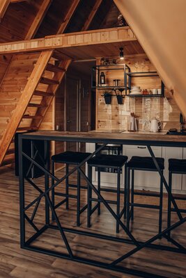 Проведите незабываемую ночь в эксклюзивных глэмпах или в необычном треугольном домике. Каждый домик оснащен мини-кухней, оснащенной необходимой посудой и техникой.